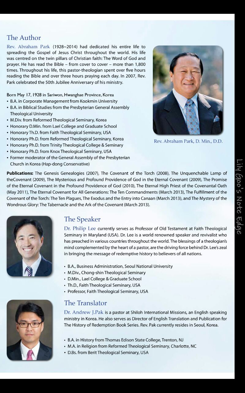 The series is a culmination of half a century of careful research and prayer by late Rev. Abraham Park, a pastor highly honored for his life‐long dedicated ministry and in‐depth conservative teachings of the Bible in the Church of Korea. The series has received international acclaim from renowned scholars and theologians, for its extraordinary depth and clarity in discovering God’s divine administration in redemptive history.